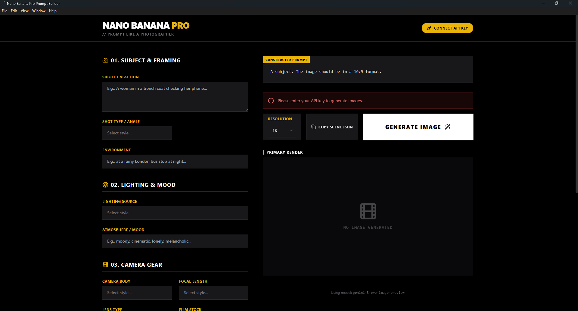 Nano Banana Pro Prompt Builder: The Subscription-Free Alternative to Higgsfield Cinema AI Take control of your AI storytelling with Nano Banana Pro, a desktop studio that delivers consistent, multi-angle scenes without the monthly fees. Built for creators who think in shots, not code, this app lets you dial in professional camera gear, lighting, and shot geometry to generate cinema-grade storyboards using your own API key. Stop renting your workflow and start directing.