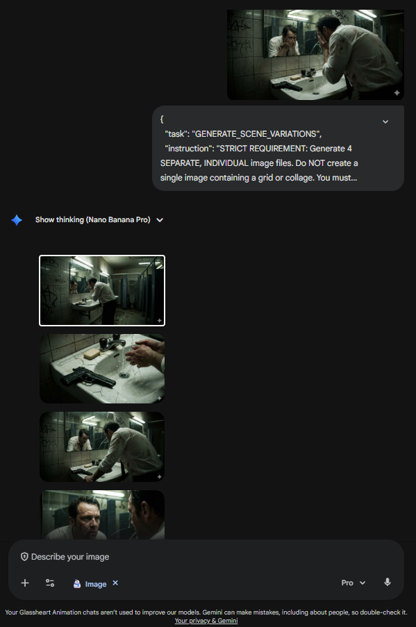- Scene Variations: Just like the cinema studio, Nano Banana Pro Prompt Builder takes your primary render and generates four distinct, consistent angles (wide, close-up, side, etc.) of the same subject and environment. Perfect for storyboards, comics, and pitch decks.