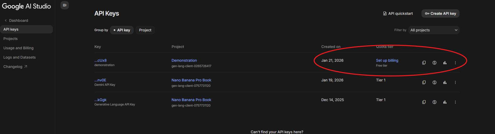 - This is your new key but it is not ready yet as it is set on the free tier. You have to set up billing then it will turn from "Free tier" to "Tier 1" this is now ready to copy.